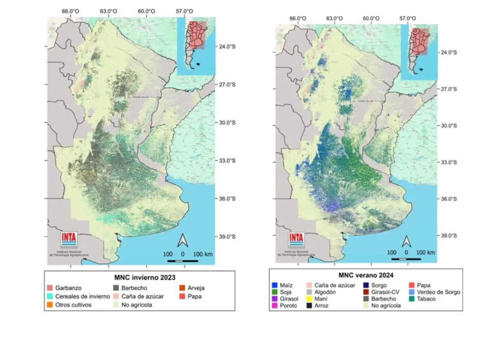 El Mapa Nacional de Cultivos 2023/24 fue elaborado por especialistas de 35 unidades del INTA en todo el país, brinda información a escala detallada sobre la ubicación de los principales cultivos extensivos para la descripción de cada campaña agrícola. Se trata de un insumo clave para planificar la producción agrícola. Con el objetivo de conocer la distribución espacial de cultivos y sus cambios en y entre campañas agrícolas que describen procesos de expansión, intensificación y rotación agrícola, especialistas de 35 unidades del INTA en todo el país -Agencias de Extensión, Estaciones Experimentales e Institutos de Investigación- publicaron esta nueva edición del Mapa Nacional de Cultivos para la campaña 2023/2024. De esta manera se completa una secuencia de mapas de seis campañas agrícolas consecutivas: 2018/2019, 2019/2020, 2020/2021, 2021/2022, 2022/2023 y 2023/24. Un mapa brinda información sobre la distribución espacial de clases previamente definidas. Constituye una manera de ordenar y simplificar una gran cantidad de información para su visualización y análisis. “Dada la dinámica de la agricultura argentina, es necesario generar los mapas en cada campaña agrícola”, explicó Diego de Abelleyra, investigador del Instituto de Clima y Agua del INTA. Debido a las similitudes entre cultivos de grano (todos herbáceos, de crecimiento anual, algunos en la misma estación, etc.) es necesario disponer de información observada a campo en los momentos en que se desarrollan los diferentes cultivos en cada región agrícola, y considerar así también la variabilidad que existe dentro de un mismo cultivo entre regiones (fechas de siembra / madurez, crecimiento / rendimiento). De acuerdo con de Abelleyra, “la información de campo es clave para poder entrenar algoritmos de clasificación para generar los mapas utilizando imágenes satelitales y estimar la precisión y el grado de error de los mapas generados”. A través de distintas unidades del INTA distribuidas a lo largo de las regiones agrícolas, se hacen relevamientos para obtener registros de los cultivos implantados en forma ininterrumpida desde la campaña 2018/2019. Esto permitió la realización de mapas de cultivos a lo largo de seis campañas agrícolas consecutivas, y así generar información con alto valor histórico sobre la ubicación de los cultivos en Argentina durante este período. Siguiendo con el investigador del Instituto de Clima y Agua, “la información generada constituye una base para conocer la historia reciente de siembra de cultivos en Argentina y describir la dinámica de cambio de especies sembradas, rotaciones, dominancia de grupos de especies, intensidad de siembra e incidencia de monocultivo”. A su vez, “al mapearse tanto el área de cultivos como otras clases no agrícolas, se pueden identificar rotaciones agrícola-ganaderas y zonas de expansión o retracción agrícola con gran detalle”, agregó. Una investigación recién publicada en la revista Agricultural Systems analizó secuencias de cultivos obtenidas a partir de cuatro campañas del Mapa Nacional de Cultivos. Allí se observó que los casos más frecuentes incluyeron rotación de cultivos, principalmente de entre maíz, soja y trigo. Cerca del 80% del área agrícola mostró al menos dos campañas con gramíneas en la secuencia. También se observó con cierta frecuencia casos con alta proporción de soja de primera, donde los casos con tres o más cultivos en la secuencia representaron cerca del 16% del área agrícola. Estos últimos casos estuvieron asociados a aspectos socioeconómicos como la distancia a puertos y aspectos relacionados con el tipo de productor y tenencia de la tierra. Otros índices derivados de secuencias de cultivos como la intensidad de siembra (número de cultivos por año), estuvieron principalmente asociados a aspectos ambientales como las precipitaciones. “La información espacialmente explícita que brindan estos mapas permite también identificar las áreas ocupadas por cada uno de los cultivos y aplicar sobre cada cultivo un modelo o analizar índices”, expresó de Abelleyra. En esta edición, se incluye un mapa que describe la estacionalidad de los lotes de maíz identificados. “Se pueden observar, de esta manera, regiones con mayor homogeneidad y siembras tardías de maíz como en el NOA, el NEA, el oeste Pampeano, y el suroeste de Buenos Aires, zonas con predominio de fechas tempranas como Entre Ríos y zonas con mayor variabilidad como la zona núcleo y centro de Buenos Aires”, concluyó. Recientemente se organizó un webinario donde además de presentar la ultima versión del Mapa Nacional de Cultivos, se analizó la dinámica temporal de los mapas previamente generados, y se mostraron ejemplos del uso en el ámbito académico, comercial, productivo y logístico. Presentan información espacial sobre los cultivos de seis campañas en un mapa nacional | Expoagro