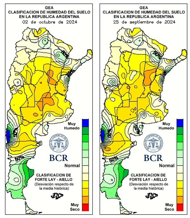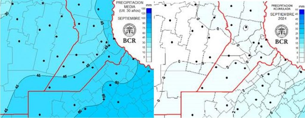 En la región núcleo, la media mensual de lluvias para setiembre es 50 mm, pero el promedio de lluvias de la red GEA/BCR fue de 0,8 mm. Lo habitual sería recibir unos 30 mm en el oeste y 70 milímetros en el este. Si bien la tormenta de Santa Rosa dejó lluvias importantes en el NE bonaerense, para el resto no ha habido lluvias significativas desde mediados de mayo. Para recomponer los niveles de humedad se necesitan entre 100 y 180 mm en las áreas más afectadas. Las lluvias normales de octubre deberían dejar 100 mm en la región, siguiendo las estadísticas. Para los 1ros 10 días del mes, por ejemplo, en Rosario deberían alcanzarse los 20 mm. Pero en el 2021 se registraron solo 2 mm; en el 2022, 5mm; y en el 2023, 2 mm.