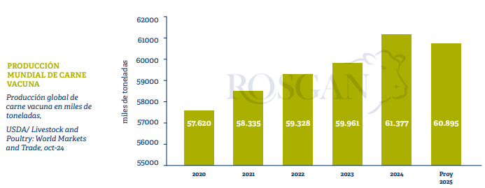 El Departamento de Agricultura de los Estados Unidos (USDA), en su último informe trimestral de oferta y demanda mundial de carnes de octubre, estimó que en 2025 la producción mundial de carne vacuna caería cerca de 500 mil toneladas a 60,9 millones de toneladas, producto de importantes disminuciones en Estados Unidos, Brasil y Unión Europea.