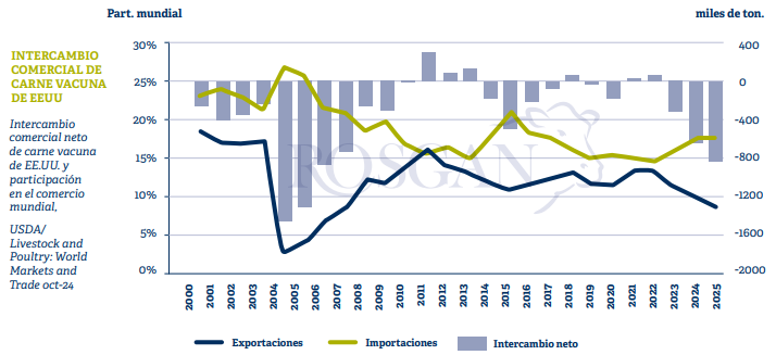 En 2003, el descubrimiento de la encefalopatía espongiforme bovina (EEB) en Canadá y luego en Estados Unidos, generó una abrupta crisis para ambos países. En el caso de EE.UU. significó un aumento en las importaciones a niveles récord en 2004 y 2005 y un derrumbe fenomenal de sus exportaciones que provocó en 2004 un déficit comercial de casi 1,5 millones de toneladas, con exportaciones reducidas a 200 mil toneladas e importaciones, trepando a máximos de 1,7 millones.