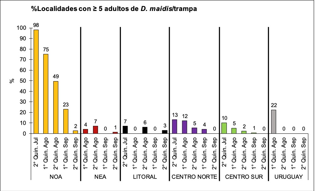 A nivel cuantitativo, de las 443 localidades relevadas en las cinco regiones críticas del país, más Uruguay, el 99% registró menos de 5 chicharritas por trampa, y en muchas el resultado fue 0. En las regiones que habían estado más comprometidas la campaña pasada, como el NOA, el Centro-Norte y el Centro-Sur del país, la presencia de Dalbulus maidis continuó descendiendo drásticamente con respecto a los relevamientos anteriores.