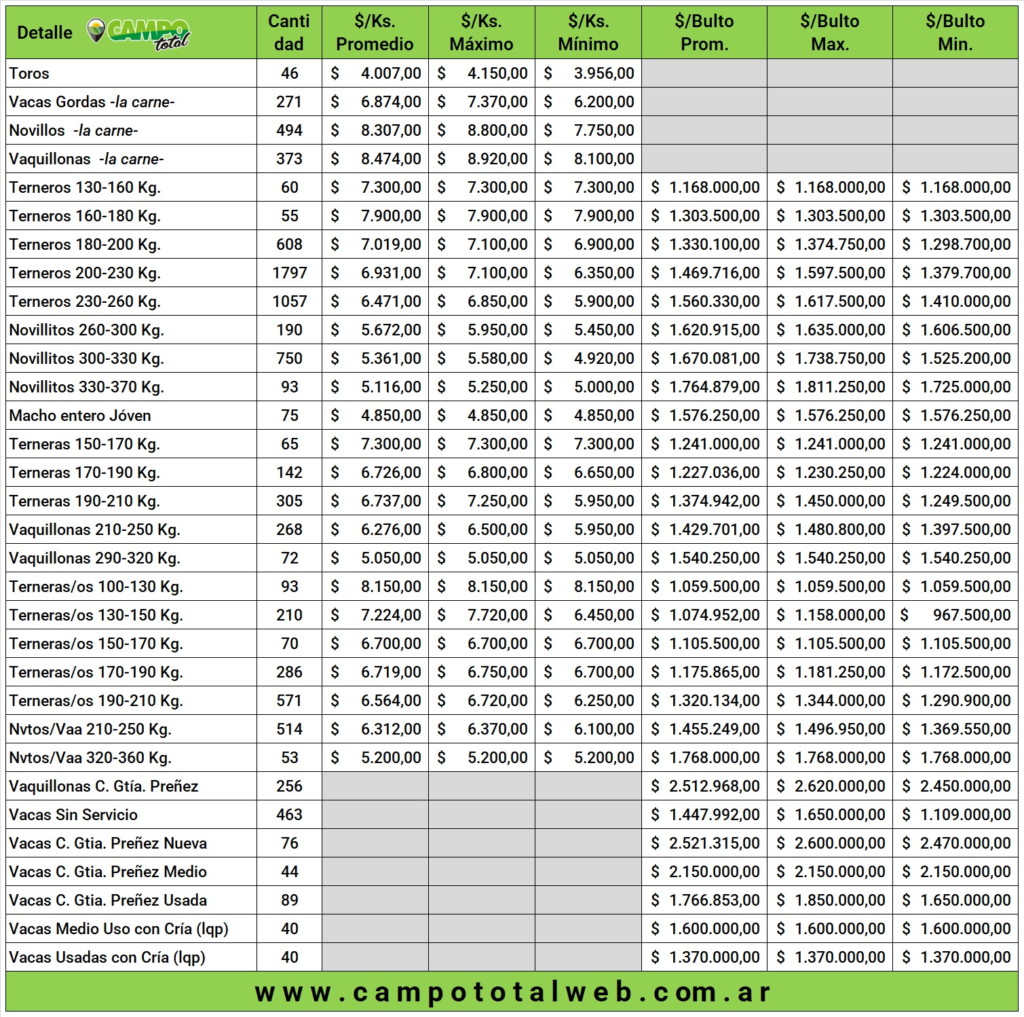 El comienzo de la invernada mostró muchos lotes destacados de terneros machos, con livianitos y un techo de 7900$ para 165 kg, con todo el ternero promedio de 180-190 kg siempre en la línea de los 7000$ con lotes a 7100$ y destacadísimos lotes, como los procedentes de la zona de Indio Rico, donde 142 terneros de 225 kg, se fueron para una cabaña de Arequito, en 7100$, sin dudas el techo de las ventas. El Novillo? Más tranquilo con valores de mercado.